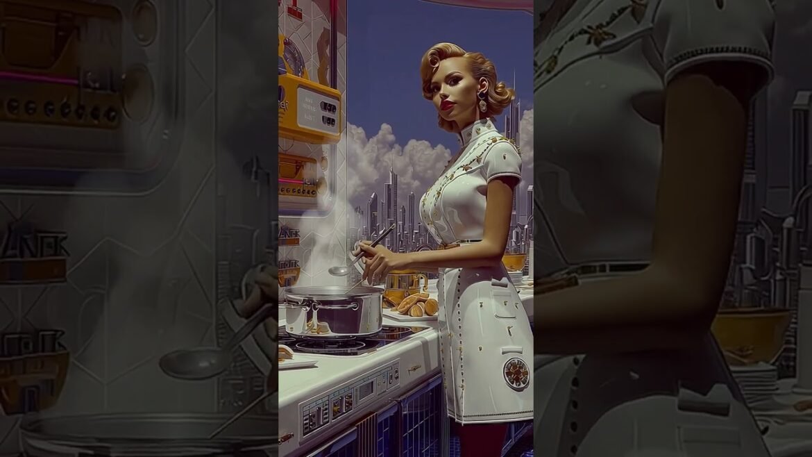 Step into a cinematic vision of 1950s space-age luxury: a glamorous American woman cooks in a dazzling Art Deco–inspired …