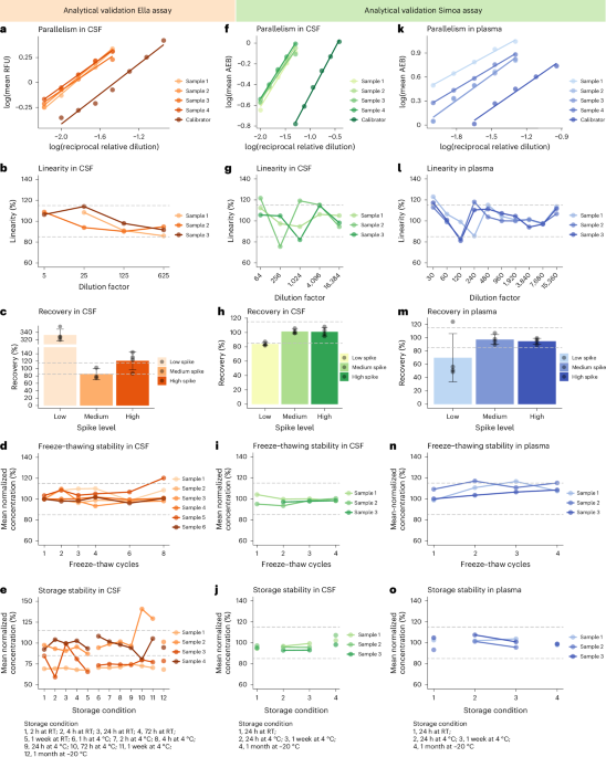 Analytical validations of the in-house-developed immunoassays were performed according to consensus guidelines25. Both assays were validated for lower limit of detection, precision, parallelism, dilution linearity, recovery and sample stability for the use in CSF (Supplementary Methods 2), and the Simoa assay was additionally validated for the use in plasma and serum (Supplementary Methods 3). Coefficients of variations of <20% were considered acceptable, and for parallelism, dilution linearity, recovery and sample stability, the accepted range of deviation of the samples from the reference condition was 85% to 115%.