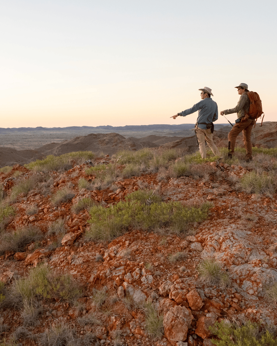 Fu (left) and Brenner survey 3.5 billion year old rocks in the Pilbara Craton, Western Australia.