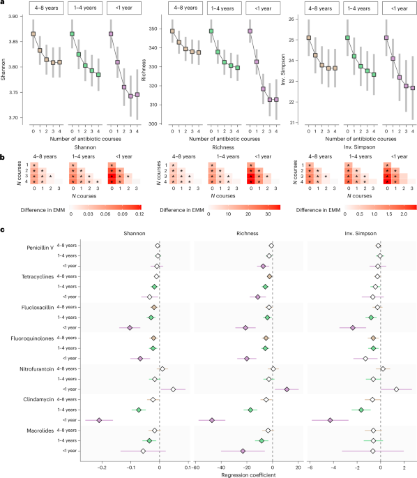 For the multivariable regression models, microbiome species diversity metrics and the abundance of each species were modeled individually as the dependent variable. The number of courses of each antibiotic class in the three periods (<1 year, 1–4 years, 4–8 years) before fecal sample collection were included as independent variables in the same model: