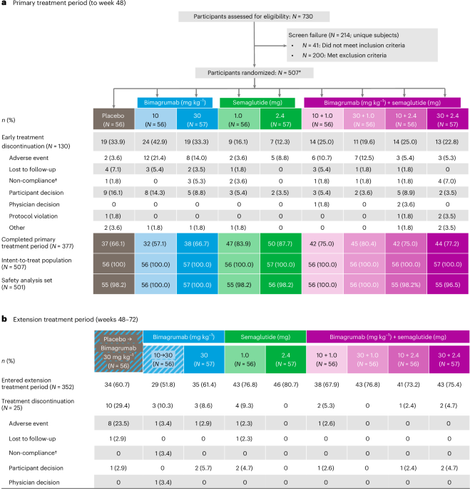 From 16 November 2022 to 16 May 2024, 730 participants were screened for eligibility. Of these, 507 were randomized to placebo (n = 56), bimagrumab (10 mg kg−1: n = 56; 30 mg kg−1: n = 57), semaglutide (1.0 mg: n = 56; 2.4 mg: n = 57) and bimagrumab plus semaglutide (combination; 10 mg kg−1 plus 1.0 mg: n = 56; 30 mg kg−1 plus 1.0 mg: n = 56; 10 mg kg−1 plus 2.4 mg: n = 56; 30 mg kg−1 plus 2.4 mg: n = 57) groups (Fig. 1). Overall, 377 (74.4%) participants completed the primary treatment period at week 48. Treatment discontinuations due to adverse events were higher in the bimagrumab groups (14.0–21.4%) than in the semaglutide (3.6–8.8%), combination (5.3–12.5%) and placebo (3.6%) groups. During the extension period, 25 (7.1%) participants discontinued treatment (Fig. 1).