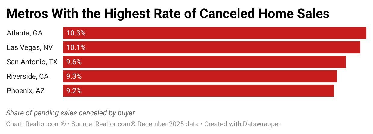 The largest percentage of buyers backing out of homes under contract are in Atlanta (10.3%), Las Vegas (10.1%), San Antonio, TX (9.6%), Riverside, CA (9.3%), and Phoenix (9.2%), according to Realtor.com data.