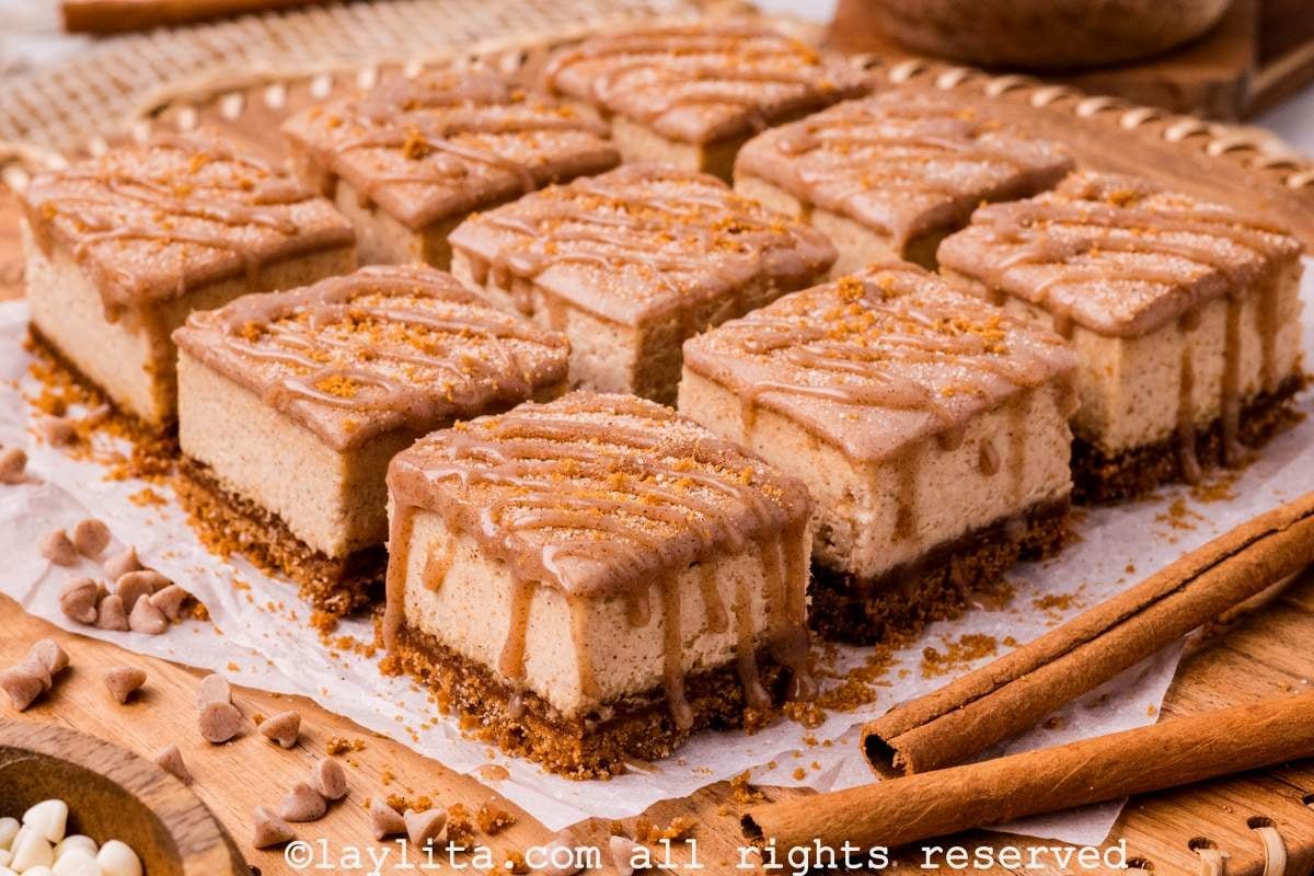 As an optional decoration, top each cheesecake bar with Cinnamon Whipped Cream and crushed Biscoff cookies.