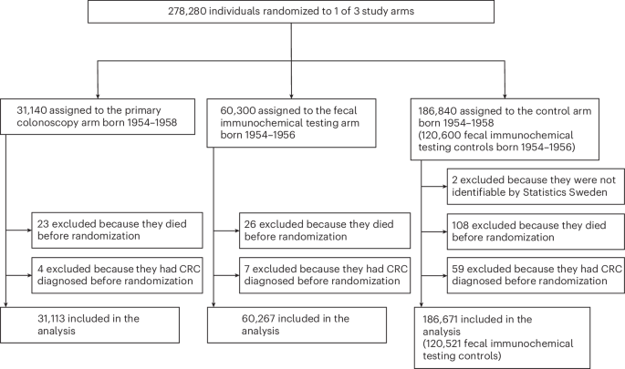We performed an individual RCT with a study base population from 18 out of 21 regions in Sweden17 comprising 74.5% of the total national population where CRC screening had not previously been offered (Stockholm, Gotland and Västernorrland regions were not included). Residents aged 60 years of age or who turned 60 in the year of randomization were identified from the Total Population Register maintained by the Swedish Tax Agency34. Individuals who had a previous diagnosis of CRC or anal cancer or who had participated in the NordICC trial were excluded8.