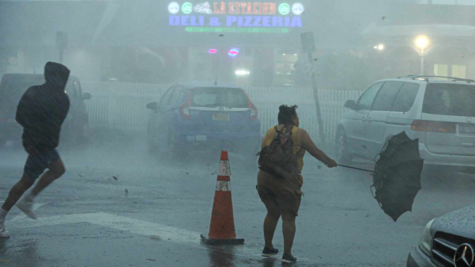 A pedestrian navigates a driving rainfall in Charleston, South Carolina.