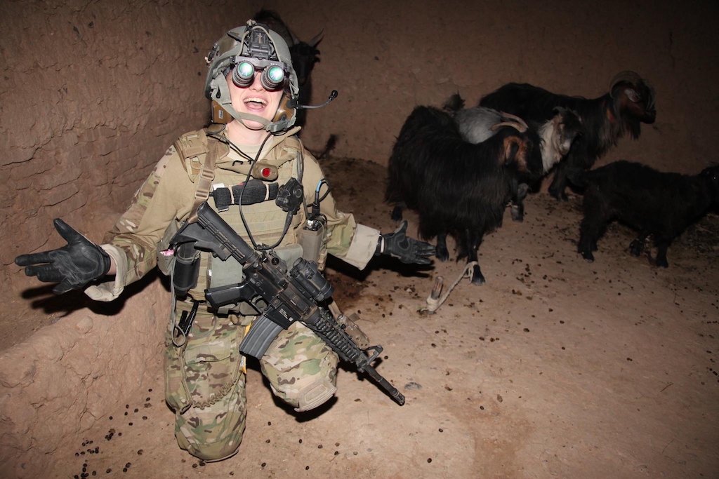 Caitlin Russell poses with goats during one of her two deployments to Afghanistan, in 2012, while serving on the cultural support team in the U.S. Army. Speaking with active-duty service members about their experiences with accessing abortion has become more difficult in the current political environment, researchers say. (Photo courtesy of Caitlin Russell)