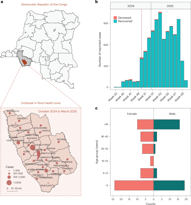A multidisciplinary outbreak investigation team from the INRB traveled to Panzi on 8 December 2024 to collect specimens and epidemiological data from suspected individuals together with the local health team. Recruitment was unselected and conducted on a first-come-first-served basis on the basis of clinical attendance. Sex was determined on the basis of physical examination and registered in the medical record; gender was not collected. The outbreak investigation team included epidemiologists, entomologists, laboratory technicians, microbiologists and an anatomopathologist. Clinical samples were collected before treatment, between epidemiological weeks 49 and 51 of 2024 (early and mid-December), from individuals who met the following syndromic case definition: persons living in Panzi from September to December 2024 who presented to a health center with at least one of the signs or symptoms: fever, cough, fatigue and runny nose with or without chills, headache, dyspnea, malnutrition, pallor or body aches18.