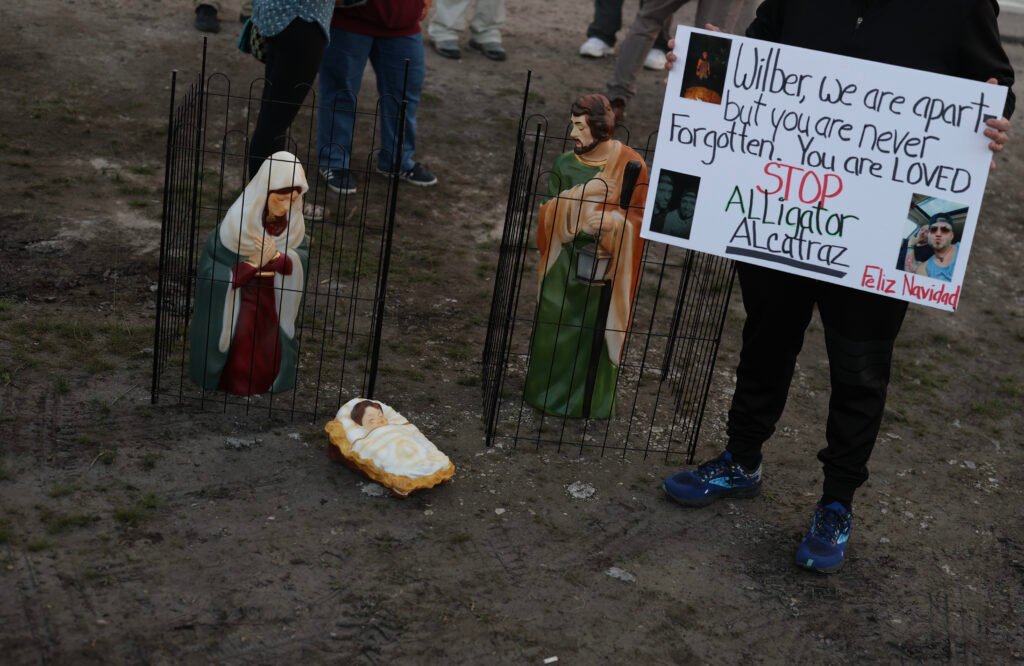 A Nativity scene depicting the birth of Jesus Christ, featuring Mary and Joseph in cages as they are held in custody, sits near the entrance to “Alligator Alcatraz” on December 21, 2025, in Ochopee, Florida. The depiction, activists said, represents a family separated from their baby as they demand that the detention camp be shut down, that the people being detained be freed, and that ICE sweeps end. (Photo by Joe Raedle/Getty Images)