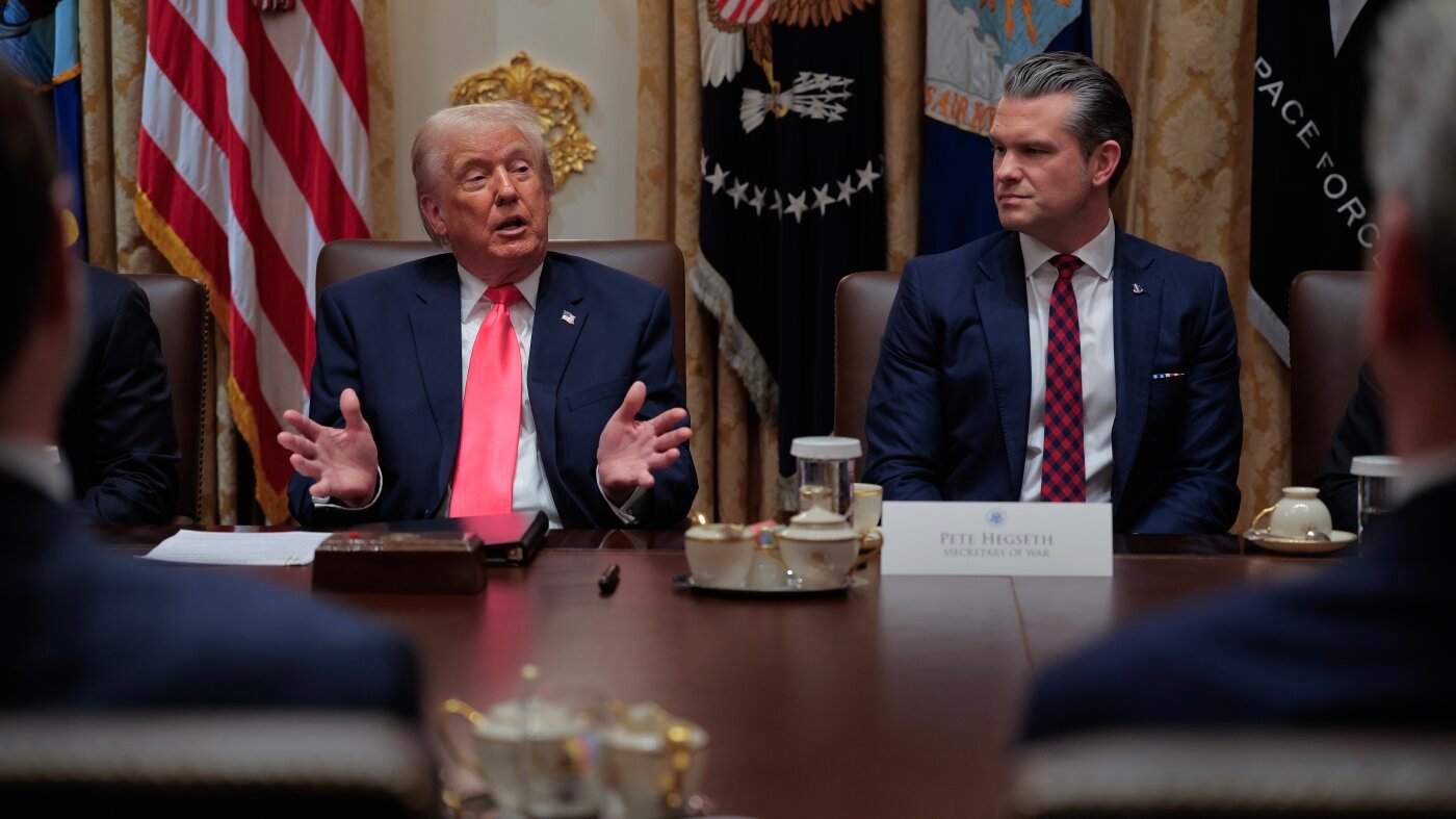 President Trump speaks as U.S. Secretary of War Pete Hegseth looks on during a meeting of his Cabinet in the Cabinet Room of the White House in December 2025.