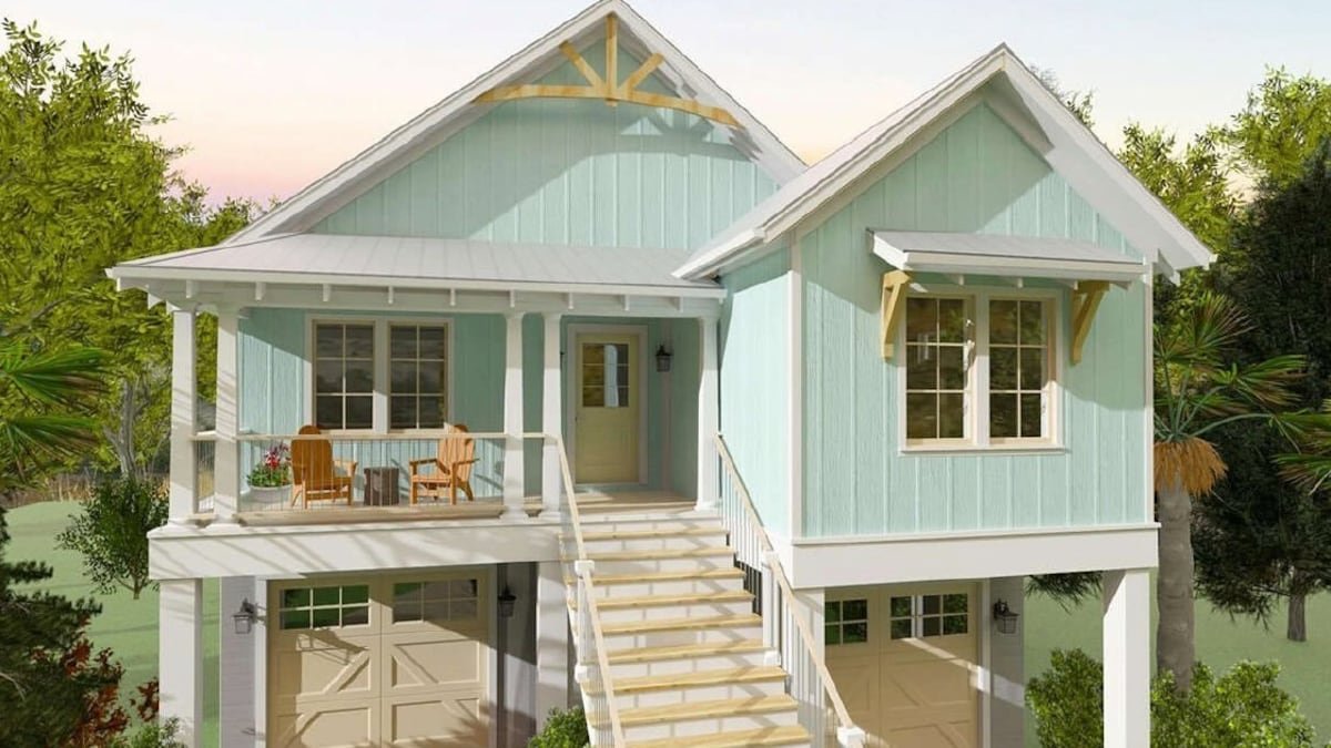 The coastal cottage design generally features an elevated floor plan with a garage or carport on the ground floor and living spaces above that are high enough to protect the structure against significant flooding damage. They’re often painted in light, earthy tones and may include second-floor balconies and Bermuda shutters, with exteriors finished in cedar or Hardie plank siding.