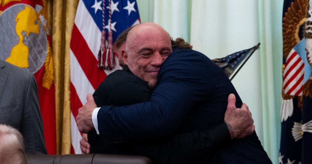 Joe Rogan hugs W Bryan Hubbard, CEO of Americans for Ibogaine during the executive order signing ceremony in the Oval Office on Saturday.Allison Robbert/ZUMA Press Wire