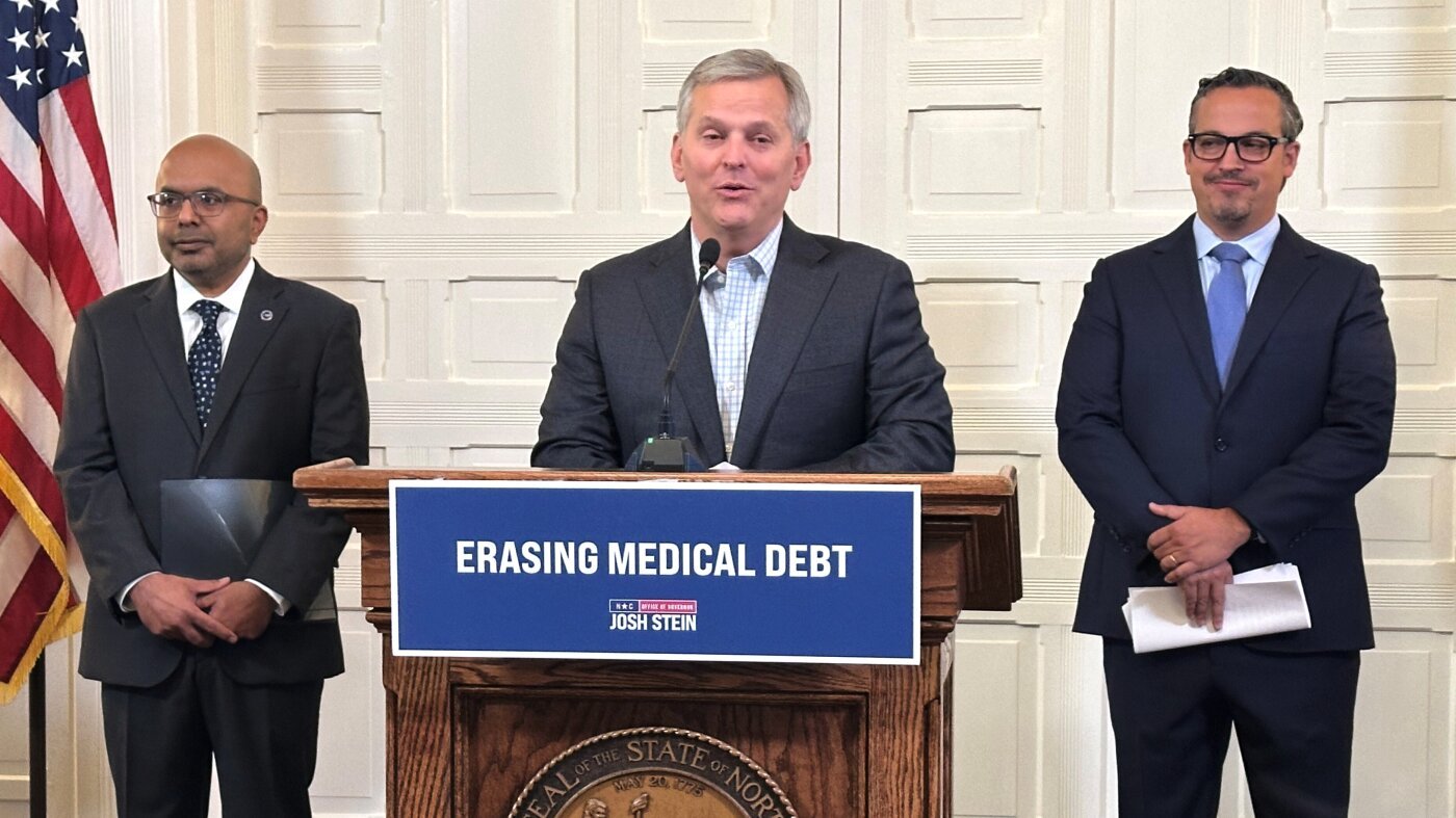 North Carolina Gov. Josh Stein (center), flanked by the state’s health secretary, Dr. Dev Sangvai (left) and an executive from Undue Medical Debt, Jose Penabad, speaks about the elimination of medical debt through an initiative involving hospitals and Medicaid in Raleigh, N.C.