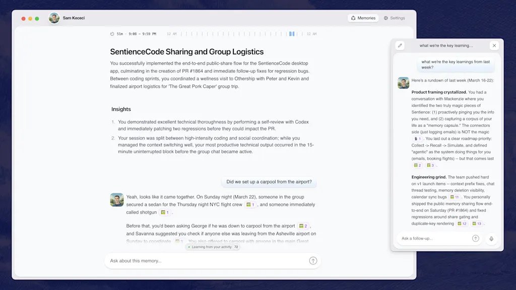 First, Sentience takes in as many inputs from a user’s digital life as possible (depending on what the user grants access to), from Uber receipts to Reddit deep dives, programming projects, and email history. Then it categorizes that data into short-term and long-term memories; short-term being whatever the user is currently working on, and long-term being everything else.