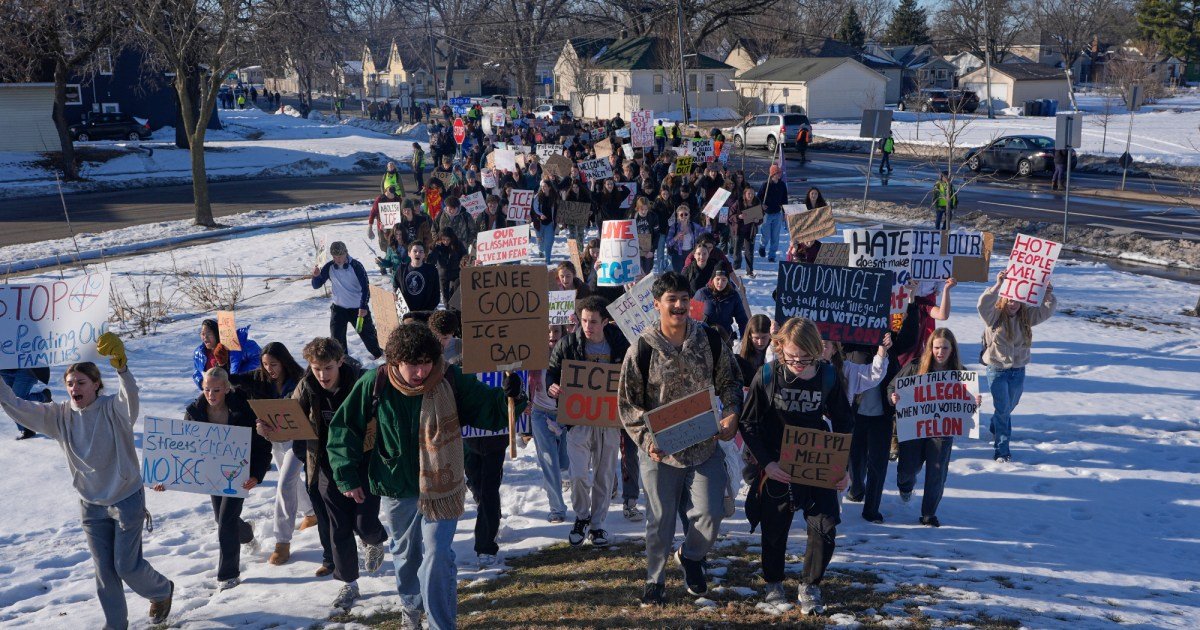 Students from Roosevelt High School protest during a walkout, Monday, Jan. 12, 2026, in Minneapolis. Jen Golbeck/AP