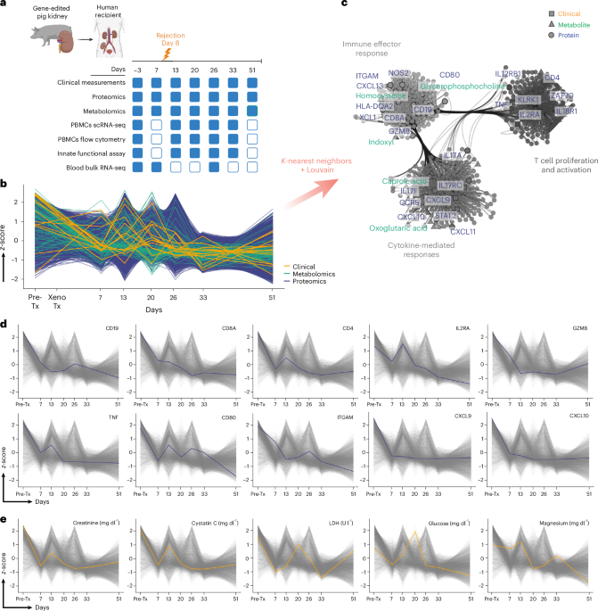 Peripheral blood was collected for serum and plasma at pretransplantation (day −3), post-xenotransplantation (days 13, 20, 26, 33 and 51) and during suspected rejection (day 7 post-transplantation). Blood was collected in heparinized tubes for PBMCs isolation at pretransplantation (day −3) and post-xenotransplantation (days 13, 20, 26 and 33). Blood was also collected in Paxgene tubes for RNA profiling (days −3 and 7) and post-xenotransplantation (day 26). The sample collection schedule is shown in Fig. 1a. The patient provided written informed consent, as approved by the MGH Human Research Committee (IRB no: 2023P003631).