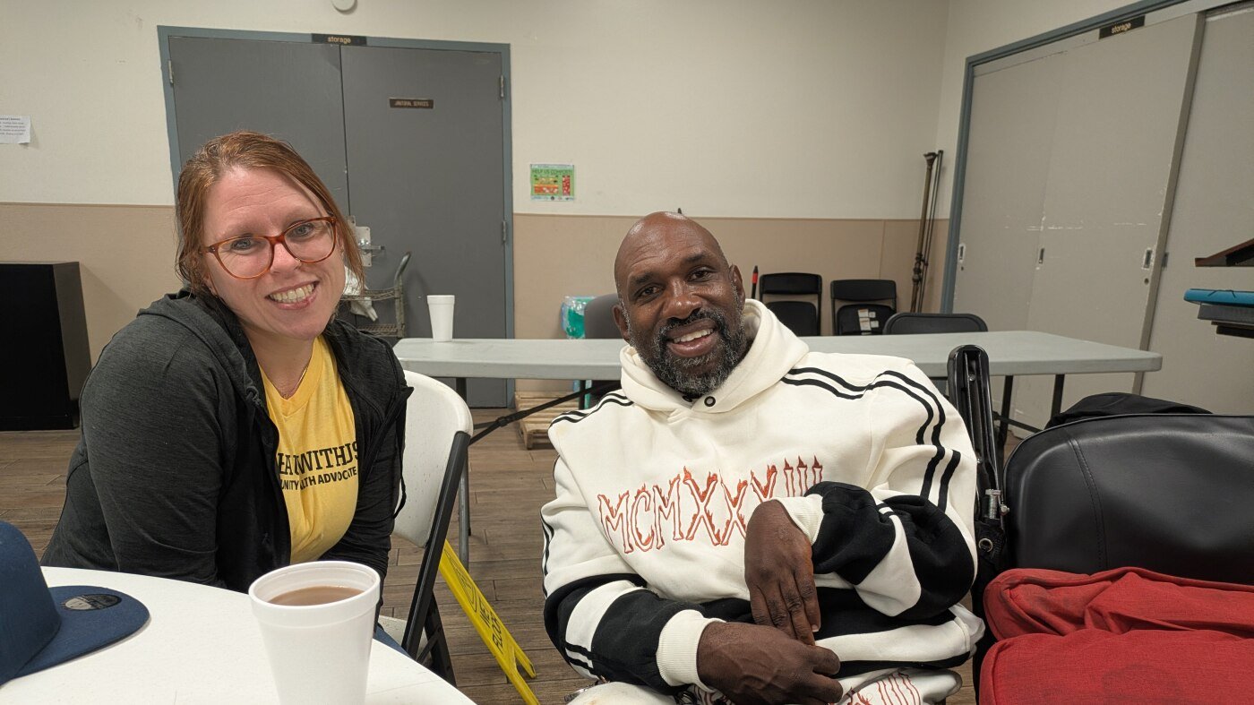 Dr. Elyse Stevens, left, attends a community breakfast at a New Orleans nonprofit, with her former patient Ronald Major who says Stevens treated him like family.