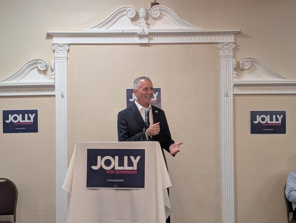 Jolly was introduced to the stage by former Hillsborough County Democratic State Attorney Andrew Warren, who remains popular with Hillsborough Democrats — perhaps even more so since Gov. Ron DeSantis removed him from office in 2022 for alleged neglect of duty and incompetence for pledging not to prosecute abortion-related or gender-affirming care cases (Warren lost his bid for re-election in 2024).