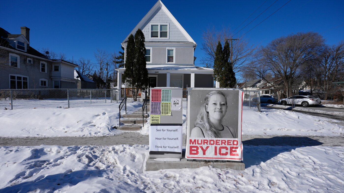 A photo of Renee Good is displayed in front of a home on Saturday, Jan. 31, 2026, in Minneapolis.