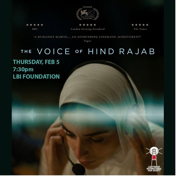 (LONG BEACH ISLAND, NJ) — Lighthouse International Film Society presents a screening of The Voice of Hind Rajab on Thursday, February 5, 2026 at Long Beach Island Foundation of Arts & Science @ 7:30pm. Based on the actual audio recordings of a 5-year-old Gazan girl trapped in a car with the bodies of her family members, the film blends documentary filmmaking with dramatization to maximize the emotional impact of this tragedy without ever seeing the little girl or the place where she lay dying.