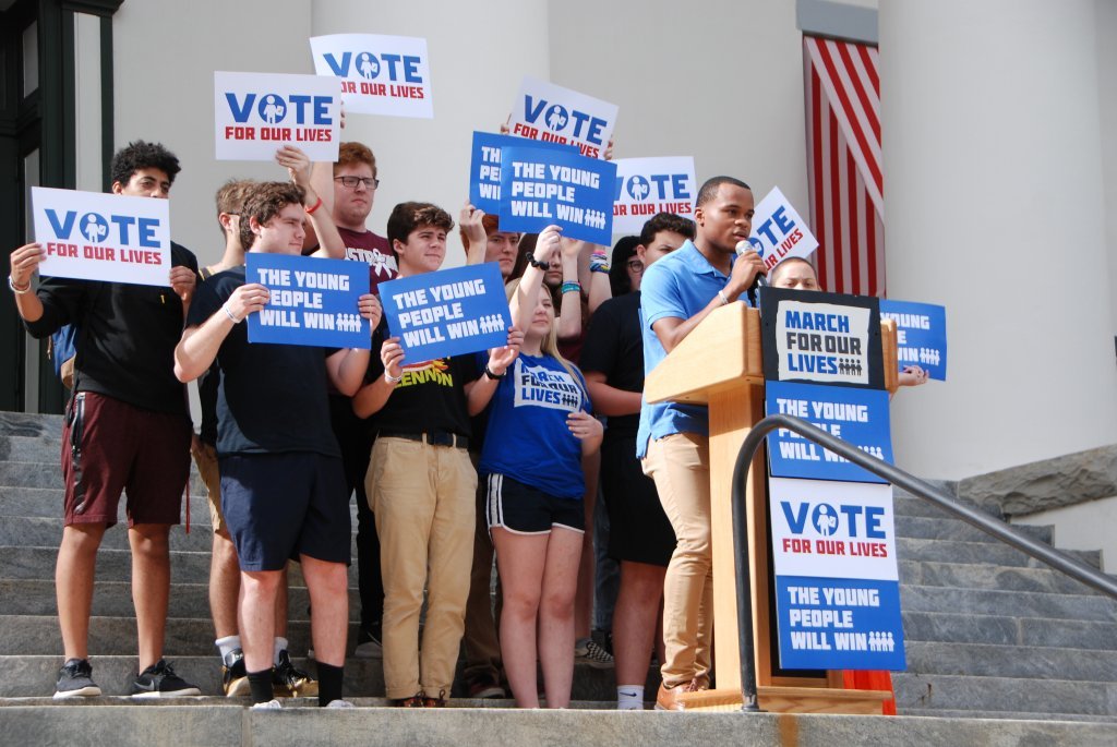 March For Our Lives member Zion Kelly addresses a crowd of press Monday, Nov. 5, 2018, on the steps of Tallahassee’s Old Capitol building as part of a Vote For Our Lives initiative to urge people to vote ahead of that November’s election. (Photo by CD Davidson-Hiers/Florida Phoenix)