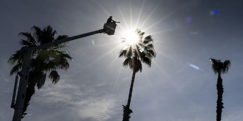 MISSION VIEJO, CA – March 16: Workers trim palm trees in the morning heat in Mission Viejo, CA on Monday, March 16, 2026.
