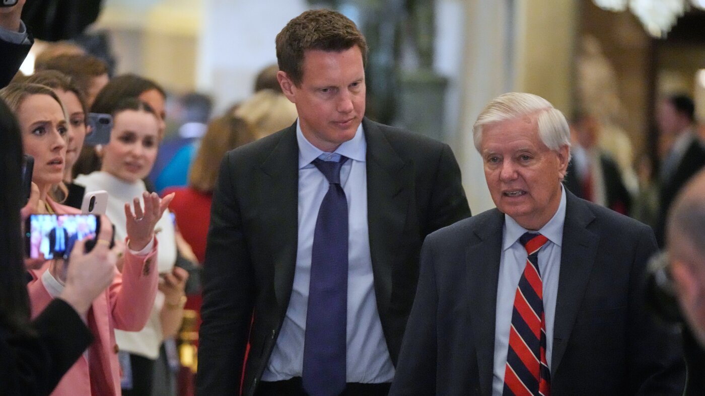 Paramount CEO David Ellison arrives with Sen. Lindsey Graham, R-S.C., before President Donald Trump delivers the State of the Union in the House chamber at the U.S. Capitol in Washington, Tuesday, Feb. 24, 2026.
