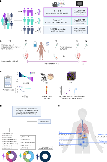 a, Cohort stratification. Participants with mPC were prospectively assigned to one of three cohorts based on germline or somatic mutation profiling and clinical response to platinum-based chemotherapy: cohort A (HRD, n = 33): core HRR gene mutations (BRCA1, BRCA2 and PALB2); cohort B (ncHRD, n = 15): non-core HRR mutations (for example, ATM, CHEK2 and MUTYH); and cohort C (HRD negative, n = 15): no HRD-associated mutations but ≥6 months of platinum sensitivity. b, Trial timeline. Schematic overview of treatment course: platinum-based induction chemotherapy (T0–T1), maintenance with pembrolizumab and olaparib, with PFS (T1–T3), on-treatment biopsy (T2) and OS tracked throughout. c, Correlative endpoints. Integrated clinical and translational analyses included demographics, RECIST version 1.1 response, PFS/OS, ctDNA profiling (MSK-ACCESS), WES for mutational patterns, zygosity, neoantigens and TME assessment by H&E and mIF. d, Screening and cohort allocation. Among 123 patients screened using MSK-IMPACT and external germline/somatic testing, 63 were enrolled and assigned to each cohort. Bottom, genomic breakdown by gene for each cohort. e, Biospecimen collection sites across timepoints. Anatomical distribution of metastatic biopsies collected longitudinally (T0–T3), with most samples from liver, pancreas and peritoneum. cfDNA, cell-free DNA; CR, complete response; M, months; mPC, metastatic pancreatic cancer; PR, partial response; SD, stable disease.