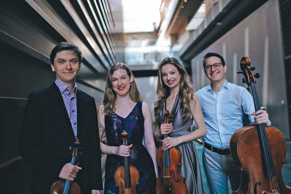 Erinys’s upcoming program at Trinity Church features Anton Webern’s Fünf Sätze für Streichquartett, a quartet in five movements, Wolfgang Amadeus Mozart’s String Quartet No. 15 in D Minor, K. 421, and Claude Debussy’s String Quartet in G Minor, Op. 10. Quartet members are Elizabeth Stewart, violin, Joosep Reimaa, violin, Marija Räisänen, viola, and Stergios Theodoridis, cello.