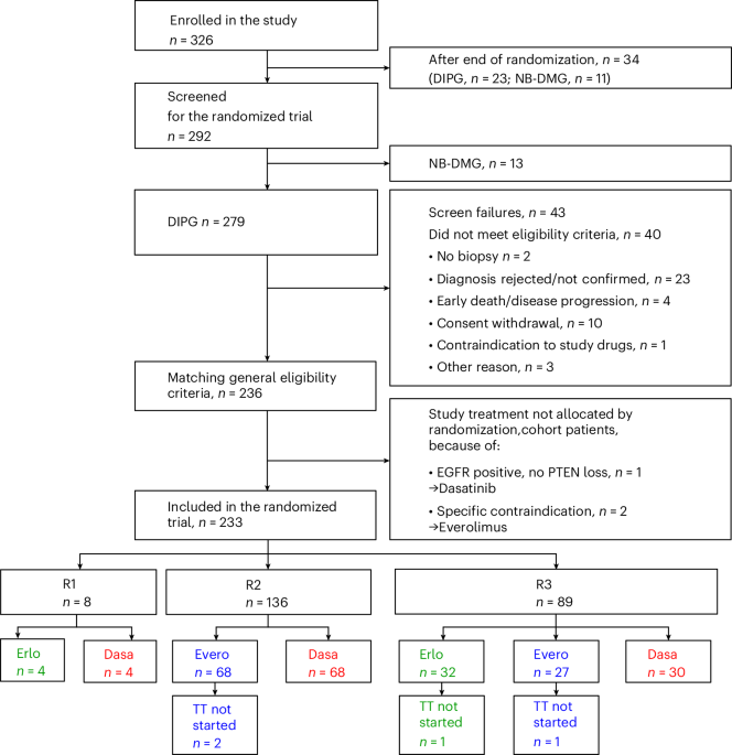 Thirty-four patients were enrolled after the end of randomization (Amendment 7) and were, therefore, not included in the analysis. Thirteen patients with NB-DMG were randomized in the trial after Amendment 7, which authorized the enrollment of DMG located outside the pons, and these patients were not considered for the main analysis. Dasa, dasatinib; Erlo, erlotinib; Evero, everolimus; TT, treatment.