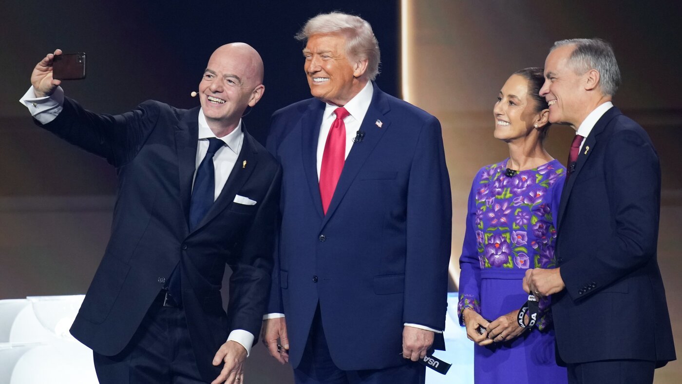 FIFA President Gianni Infantino (left) takes a selfie with President Trump, Mexican President Claudia Sheinbaum, and Canadian Prime Minister Mark Carney during the FIFA World Cup 2026 Official Draw at the John F. Kennedy Center for the Performing Arts in Washington, D.C., on Dec. 5, 2025.