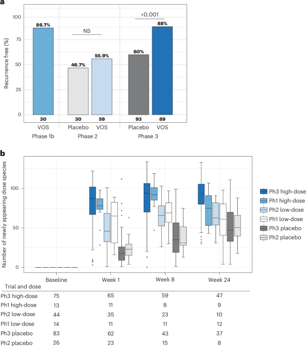 The phase 3 preplanned microbiome-related analyses included evaluation of VOS dose species engraftment, changes in species composition and bile acid concentrations in VOS as compared to placebo groups from baseline to weeks 1, 2, 8 and 24 (ref. 12). Preplanned analyses of microbiome compositional and targeted metabolomic for primary and secondary bile acids were performed on the safety population, and the distribution of patient engraftment and secondary bile acid measurements within treatment group were assessed with non-parametric median and interquartile range statistics. The evaluation of engraftment, changes in species composition and bile acid concentrations presented herein are post hoc analyses consistent with the preplanned statistical analysis with the following deviations. (1) The population for the preplanned microbiome analyses comprised all patients who were randomized, received any amount of study drug and who provided at least one evaluable stool sample before treatment and at least one evaluable stool sample after treatment. In these post hoc analyses, samples collected after treatment of an on-study CDI recurrence were excluded, as treatment of C. difficile recurrence requires antibiotics, which impact microbiome signals (Extended Data Fig. 1). These post-recurrence, post-antibiotic samples were more common in patients receiving placebo, where the recurrence rate was significantly higher. Removal of these samples enables examination of the impact of treatment without the confounding impact of antibiotics. (2) For analyses not requiring both pretreatment and posttreatment samples to derive values, both single and paired pretreatment/posttreatment stool samples were used. (3) Bile acid concentrations were compared directly as absolute concentrations instead of evaluated as change from baseline to enable clear communication of results. Comparisons to VOS phase 1, VOS phase 2 and the healthy comparator cohort, as well as fatty acid concentration measurements, were not preplanned.
