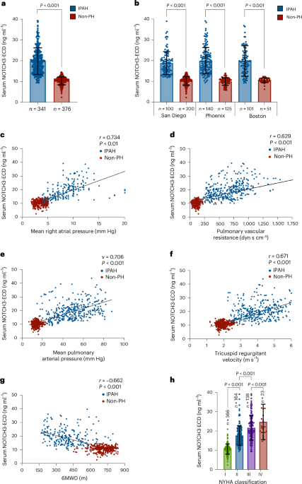Between 2010 and 2021, serum samples were prospectively collected from 341 individuals with IPAH and 376 without PH (Table 1) being treated at the University of California, San Diego (UCSD) (San Diego cohort: 100 IPAH, 200 non-PH), the University of Arizona (Phoenix cohort: 140 IPAH, 125 non-PH) and the Massachusetts General Hospital (Boston cohort: 101 IPAH, 51 non-PH) (Table 1). A sample size of 341 individuals with IPAH and 376 individuals without PH was calculated to provide 90% power to detect a minimum effect size of 0.27 for the difference in serum NOTCH3-ECD levels between the two groups with a two-sided α = 0.05. The San Diego and Phoenix IPAH patient samples were collected on an outpatient basis, whereas the Boston patients with IPAH had serum collected during ICU hospitalization for IPAH. Informed consent was obtained for all individuals from each cohort. Patient sex was determined by assigned sex according to each patient’s hospital records. All IPAH blood samples were collected within 1 month of RHC or ECHO. Control individuals in the San Diego and Phoenix cohorts were healthy paid volunteers, whereas the Boston control cohort comprised ICU patients without PH, being treated for other non-lung-related diseases (51 nonintubated patients comprising 37 multi-trauma orthopedic patients without lung contusion, acute respiratory distress syndrome or pulmonary embolism; 10 individuals recovering from elective large abdominal, vascular or orthopedic operations; 3 patients with a closed head injury; and 1 patient with amyotrophic lateral sclerosis). All individuals, including controls, underwent RHC as part of this study. All IPAH patients tested negative for HIV and active hepatitis viral infection, as well as anti-nuclear, anti-centromere, anti-mitochondrial, anti-double-stranded DNA, anti-topoisomerase 1, anti-Ro and anti-La antibodies. No patient with IPAH was undergoing evaluation for liver transplantation or had received a previous liver transplant. Patients with IPAH did not undergo genetic testing at the time of diagnosis and none had a family history of PAH (WHO group 1) or other PH (WHO groups 2–5). The determination of IPAH was made by an integrated assessment by an experienced PH pulmonologist or cardiologist, with further adjudication as needed by a committee of PH physicians. Inclusion and exclusion criteria for the diagnosis of IPAH is given in Supplementary Table 1.