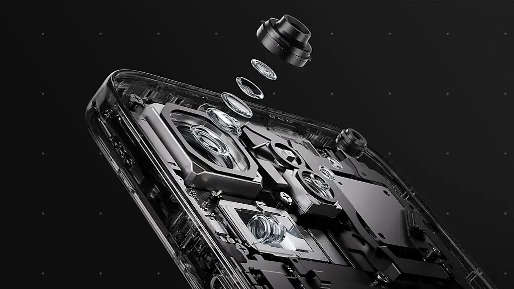 The most conspicuous element is the “uni-chassis” camera bump that stretches across the entire top third of the phone. The whole construction is covered by a single opaque piece of glass, obscuring the actual camera hardware. The bottom edge of the camera module is highlighted by a red LED that flashes on for notifications and is reminiscent of sports car taillights.