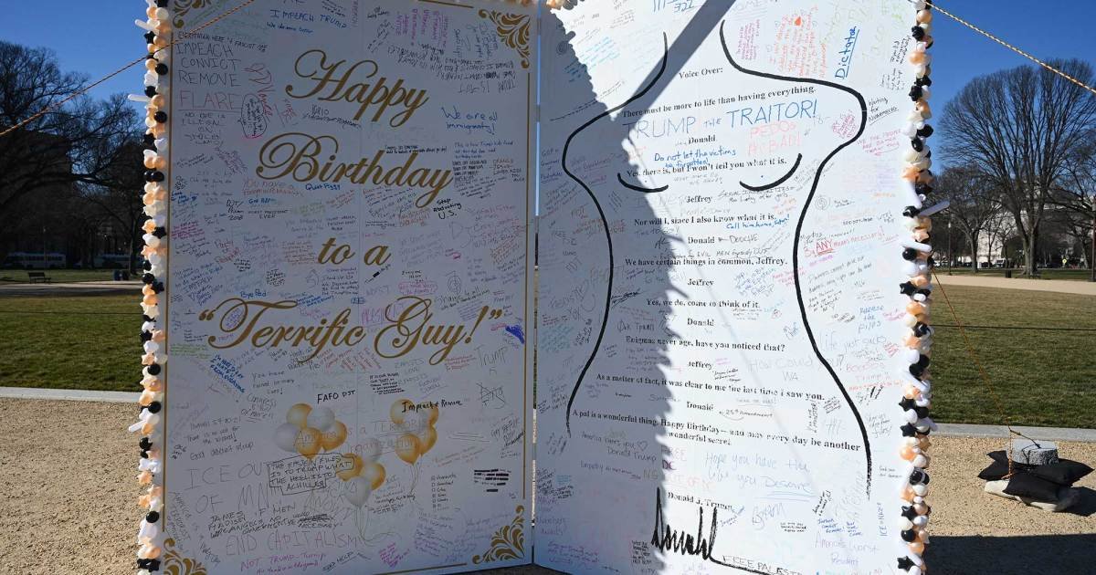 A protest art installation featuring “The Epstein Birthday Card” at the National Mall in Washington, DC, on January 21. Olivier Douliery/Sipa via AP