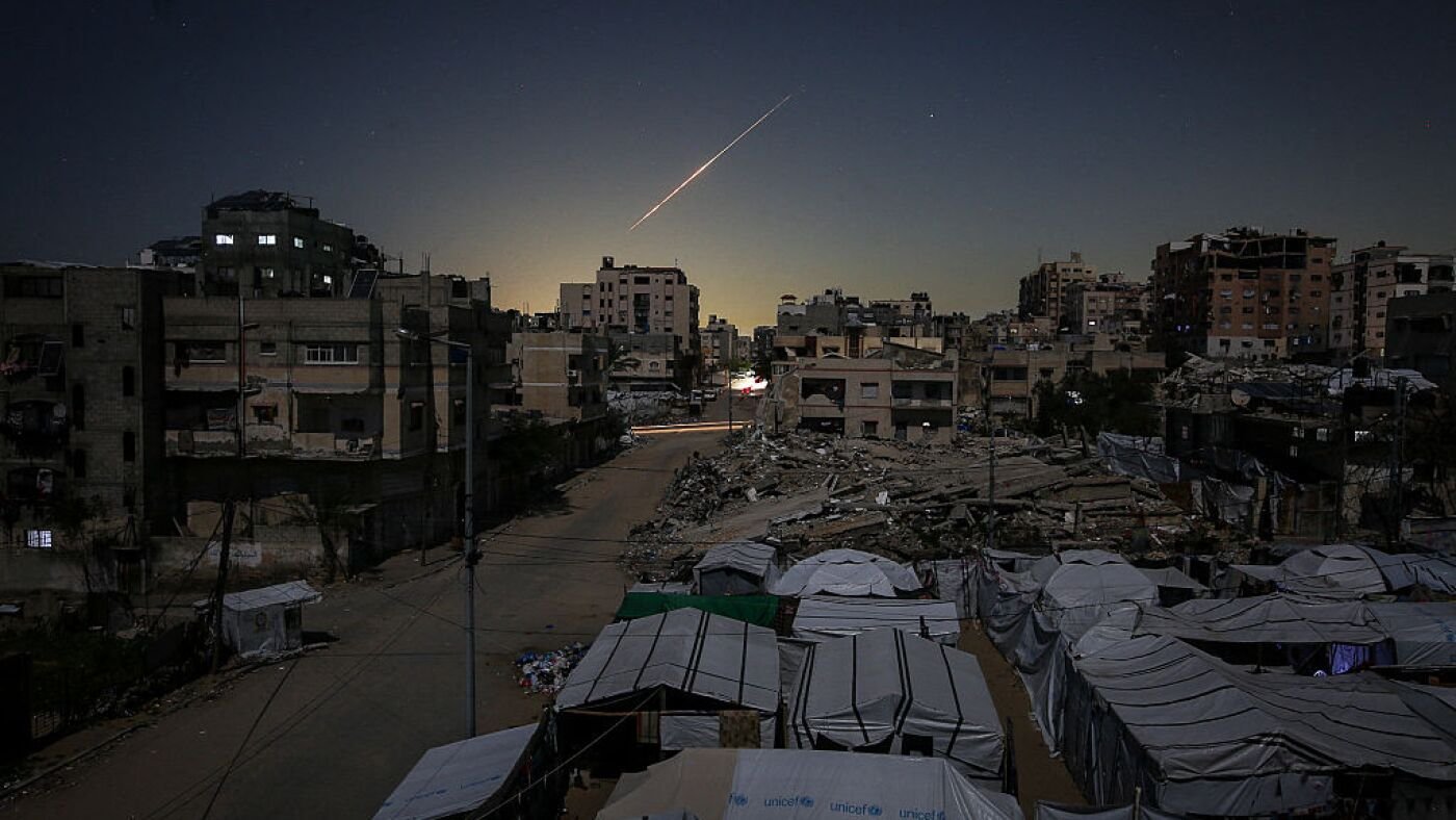 Iranian rockets heading toward Israel are seen crossing the sky over Gaza City on March 3, 2026, as they travel toward Israeli territory amid escalating regional tensions.
