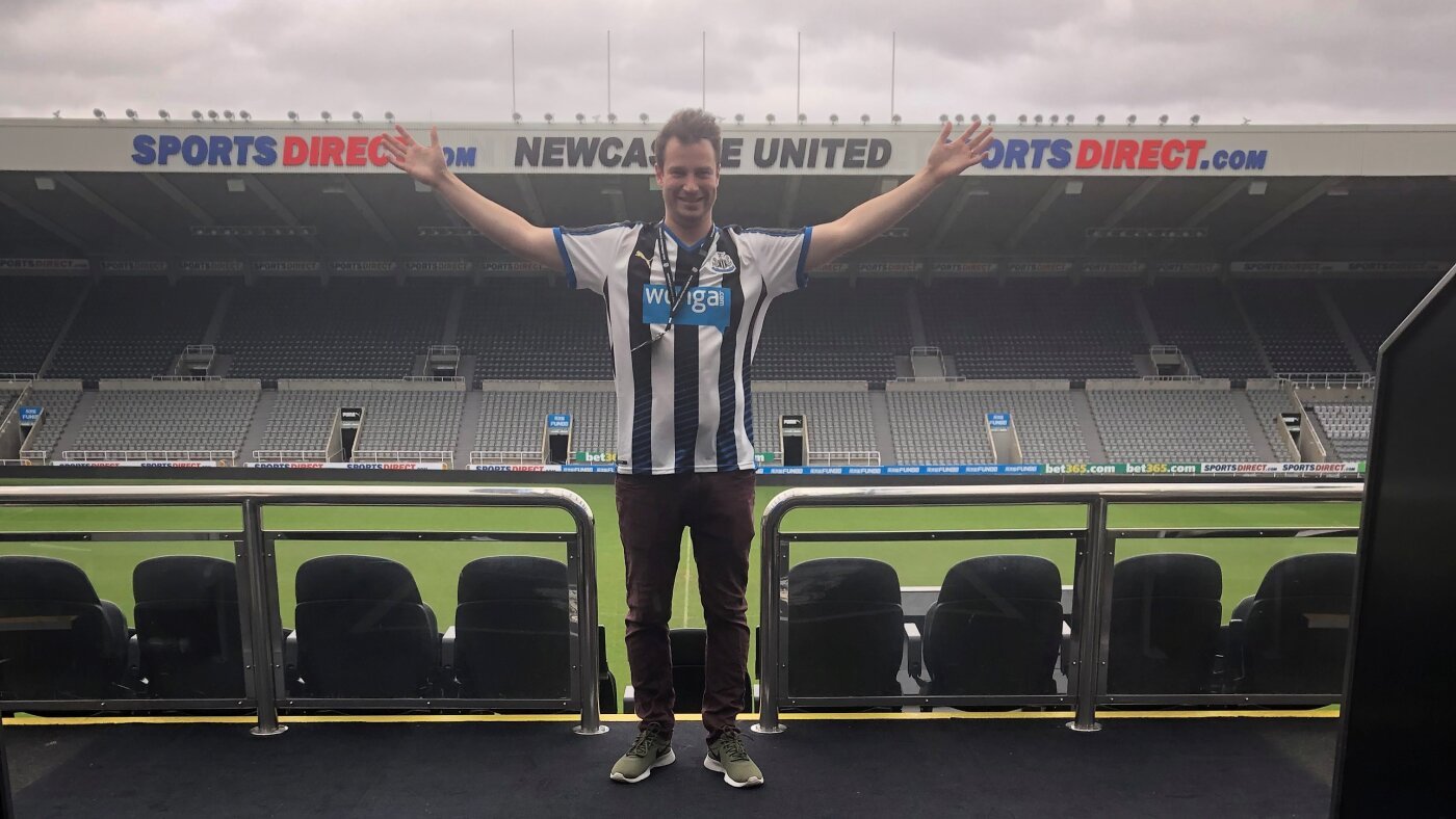 Ty Malugani posing at St. James Park, the stadium of Premier League team Newcastle United in Newcastle upon Tyne, England.